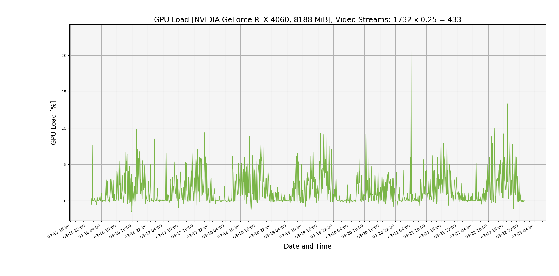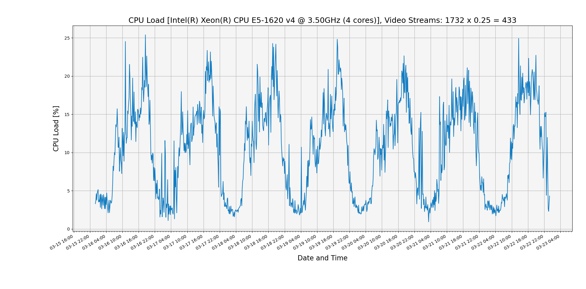 Below are the load data for a cluster of two different servers with different shares of video stream processing. In this case, these are intercom cameras installed in apartment buildings, and processing is based on motion detection.