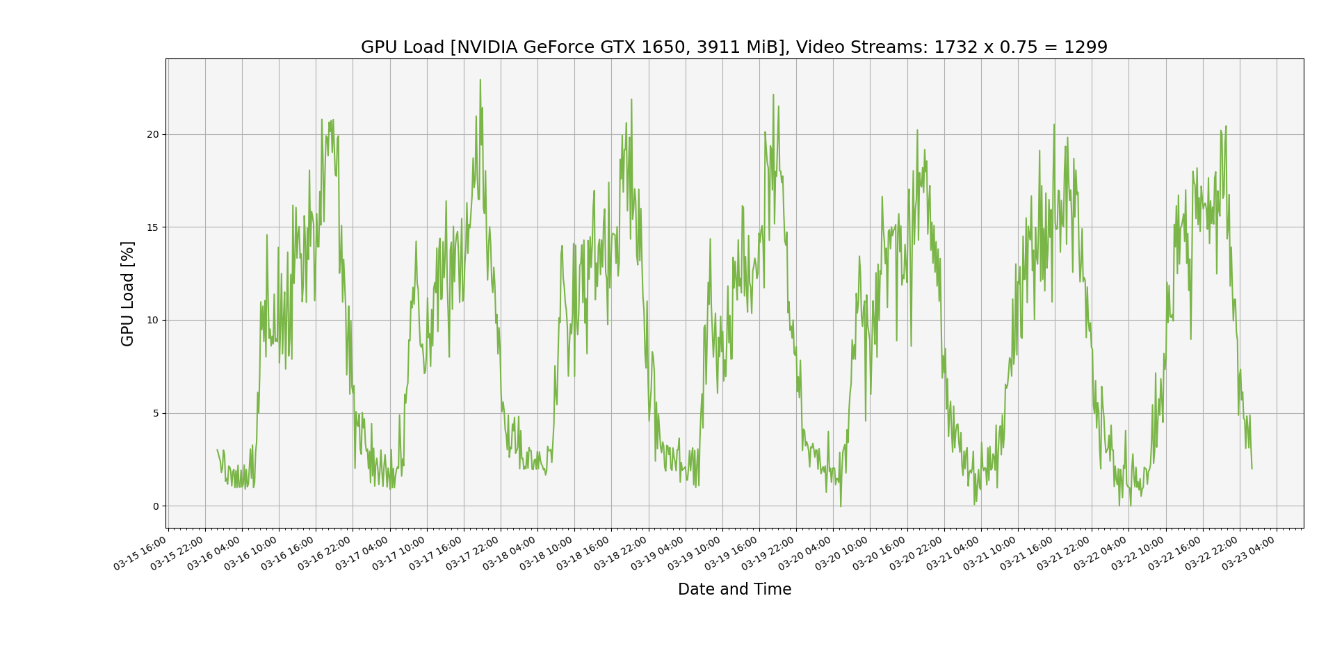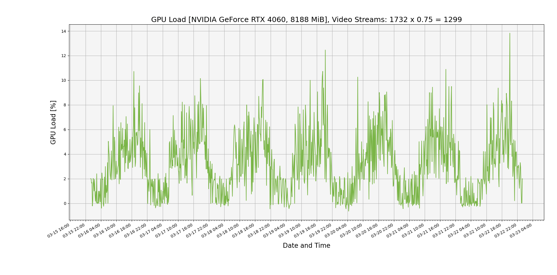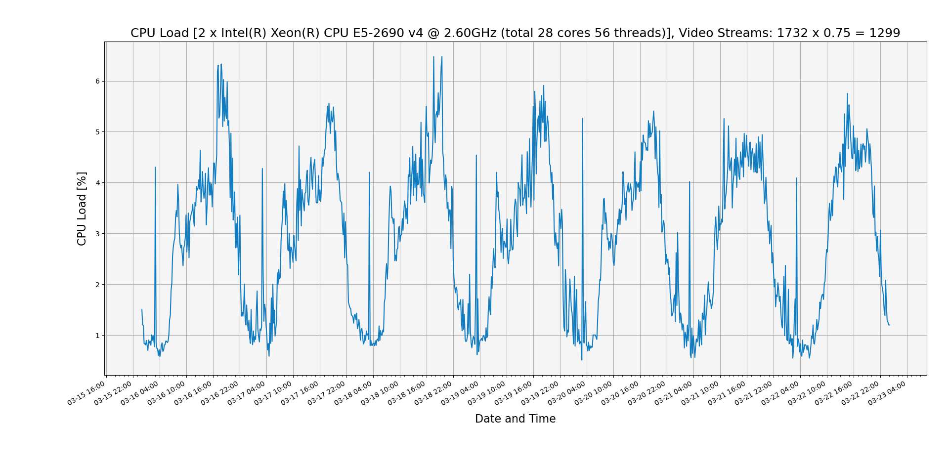 Ниже представлены данные по нагрузке для кластера из двух неодинаковых серверов с разными долями обработки видео потоков. В данном случае - это камеры домофонов, которые установлены в многоквартирных домах, а обработка ведётся в соответствии с детекцией движения.